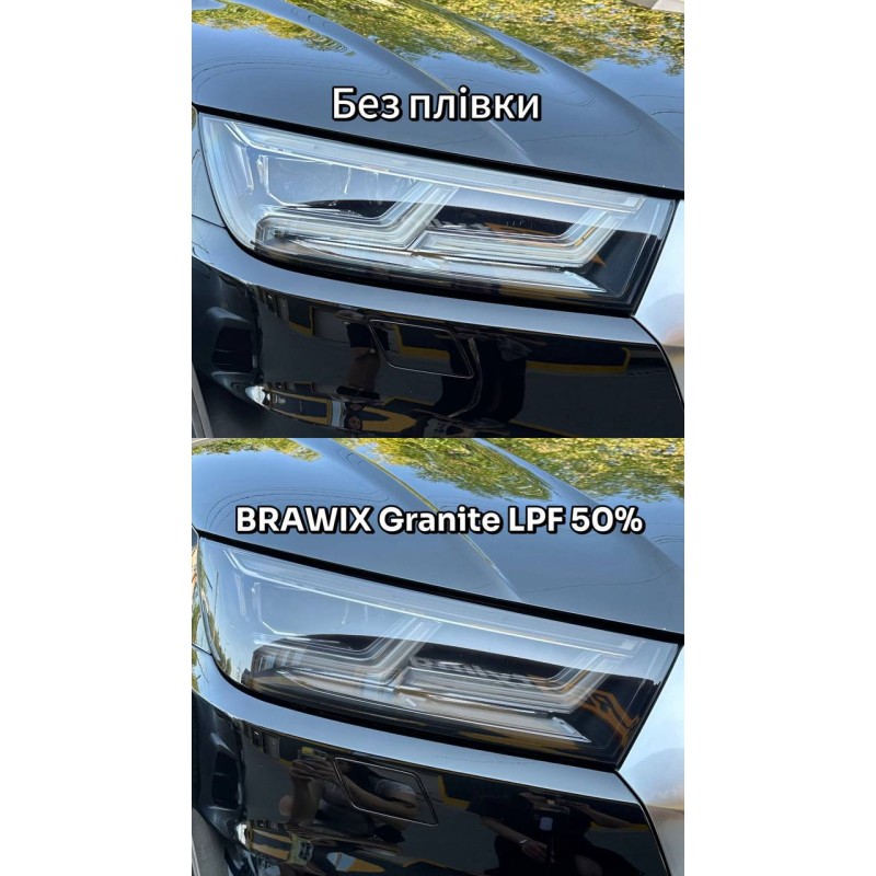 Антигравійна поліуретанова плівка BRAWIX Granite PPF з затемненням - для захисту оптики від відколів і подряпин. Матеріал має спеціальний тонований шар, завдяки якому плівка на оптиці створює ефект красивого затемнення оптики.