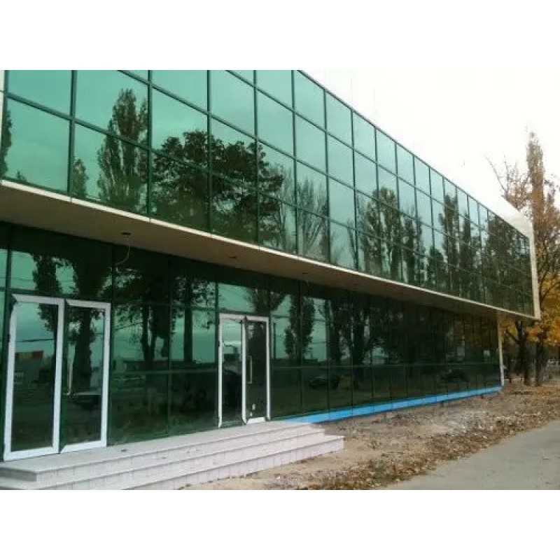 Зелена дзеркальна плівка відмінно захистить приміщення від інфрачервоного і ультрафіолетового випромінювання. Найцікавіше вона буде виглядати в поєднанні з алюмінієвими і ламінованими під дерево вікнами.