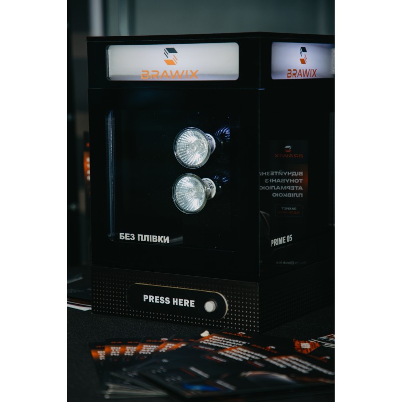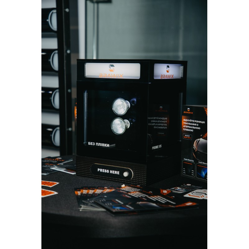 Демонстраційна лампа BRAWIX завдяки такому боксу ви з легкістю зможете переконати клієнта у виборі атермальної плівки BRAWIX та наглядно гарантувати її високу якість. Вона має 4 сторони. Одна сторона без плівки, друга сторона металізована серія і дві наступних нанокерамічна серія. Ви її вмикаєте, ваш клієнт підставляє руку і відчуває, як рука нагрівається там, де плівки немає. Повертаємо на металізовану серію, він відчуває, що тепло проникає вже значно менше, але все одно нагрівається. І коли ви повертаєте там, де нанесена нанокерамічна серія, він відчуває, наскільки ефективно працює ця плівка. Завдяки цій демонстрації атермальна плівка вже не здається дорогою. Окрім того, що лампа допоможе збільшити ваші продажі, також вона має дуже презентабельний вигляд. Такий бокс - це ще одна причина, чому варто зупинити свій вибір на продуктах компанії BRAWIX.