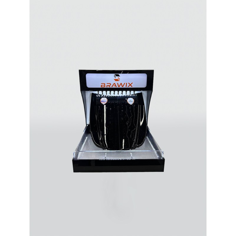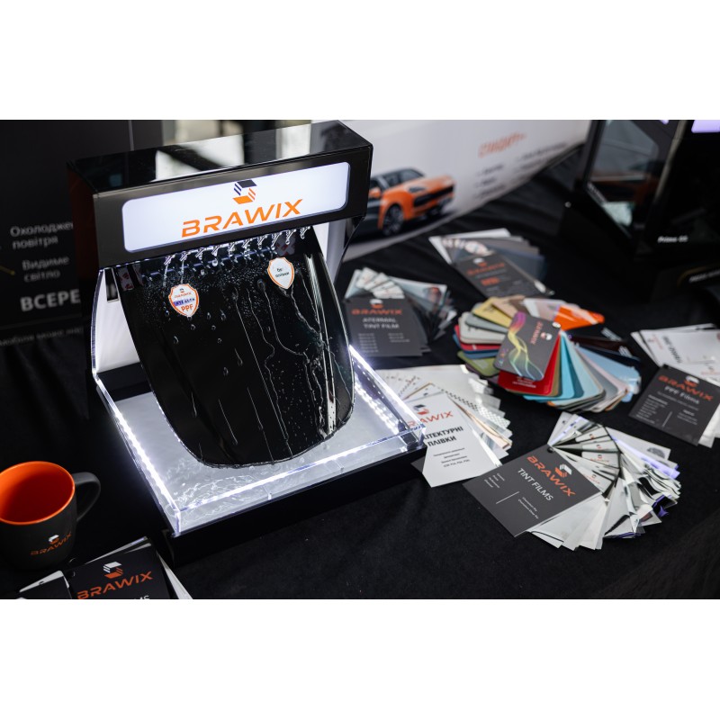 Стенд призначений для наочної демонстрації гідрофобних властивостей захисної плівки BRAWIX. Оснащений макетом капота автомобіля, розділеного на дві частини: одна половина не захищена, інша — покрита плівкою BRAWIX. Такий контраст дозволяє чітко побачити ефект водовідштовхування та переваги захисту. Ідеальний для презентацій у автосалонах, на виставках і в точках продажу автозахисних матеріалів.