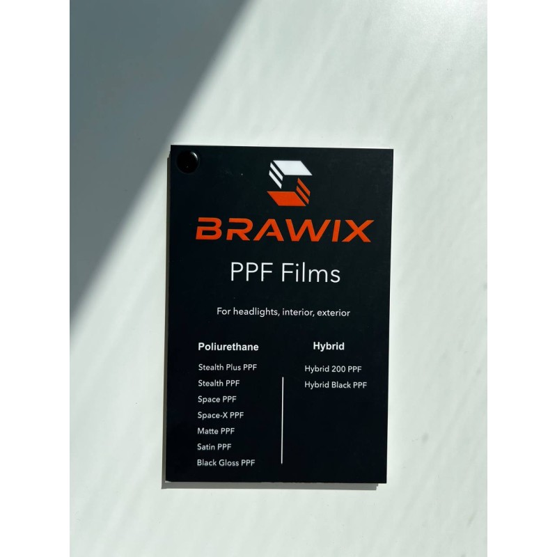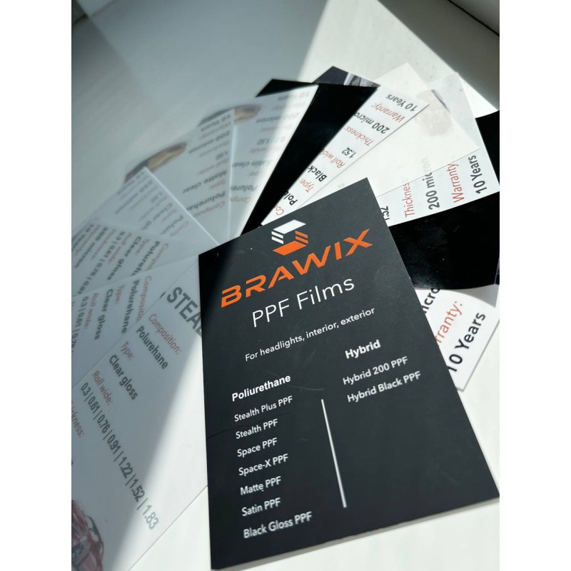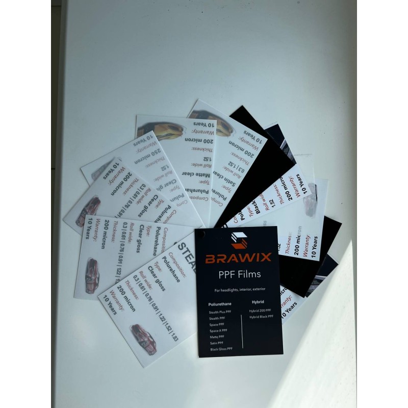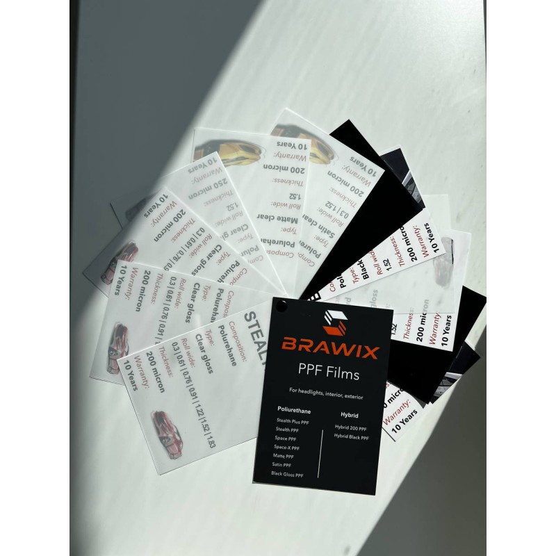 Комплект зразків антигравійних плівок BRAWIX надає можливість ознайомитись із різними типами поліуретанових та гібридних матеріалів, представлених у лінійці бренду. Це незамінний інструмент для майстрів з установлення, студій детейлінгу, а також клієнтів, які хочуть побачити реальну якість та характеристики матеріалу.