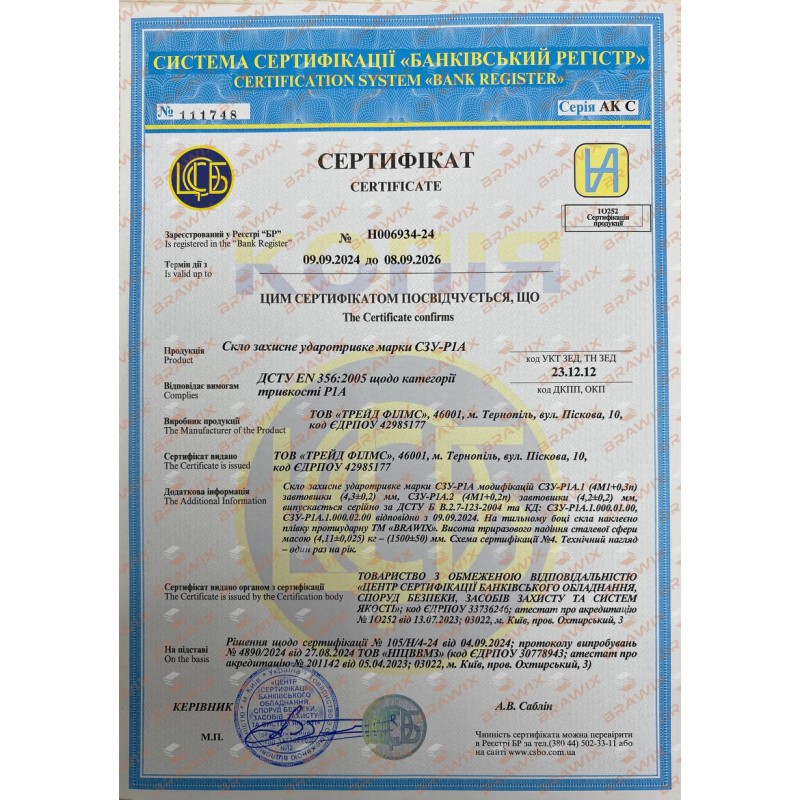 Сертифікат підтверджує, що продукція «Скло захисне ударотривке марки СЗУ-Р1А» відповідає категорії стійкості Р1А відповідно до ДСТУ EN 356:2005 та ДСТУ 78.11.902-1. Сертифікат виданий «Центром сертифікації банківського обладнання, споруд безпеки, засобів захисту та систем якості».
