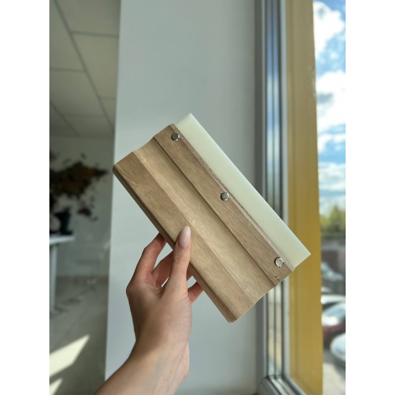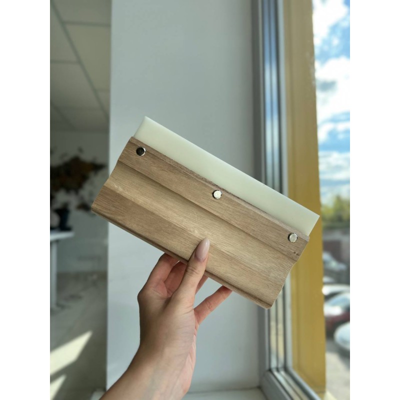 Ракель дерев\'яний-зручний інструмент для віджиму води при поклейці плівок на плоских стеклах. Особливо зручний при наклейці плівок на монтажному столі в цеху.