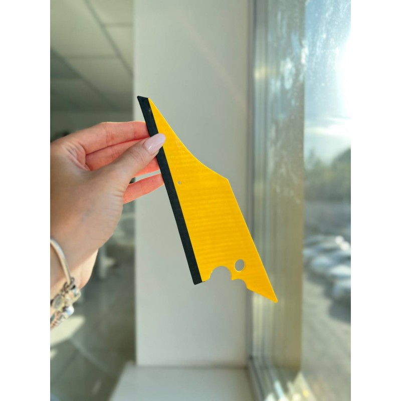 Середньої жорсткості еластична гумова смужка жовтого кольору в нижній частині інструменту може бути використана для віджиму води.